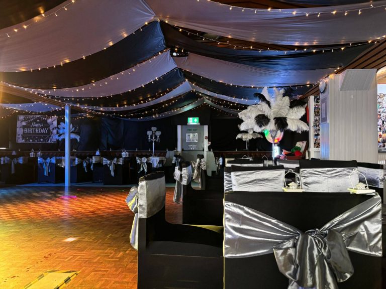We transformed the space by adding elegant ceiling drapes, warm fairy lights, and dark backdrops to create a cozy, intimate atmosphere. To elevate the celebration even further, we incorporated a selection of disco lighting to give the dance floor that extra special touch🕺💃