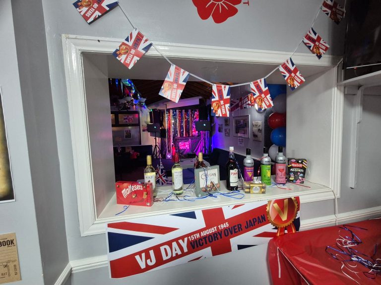 The thoughtful styling helped transform the space into a meaningful VJ Day remembrance celebration, proving that even simple event decorations and patriotic party décor can create a powerful atmosphere for historic commemorations, community celebrations, and military remembrance events.